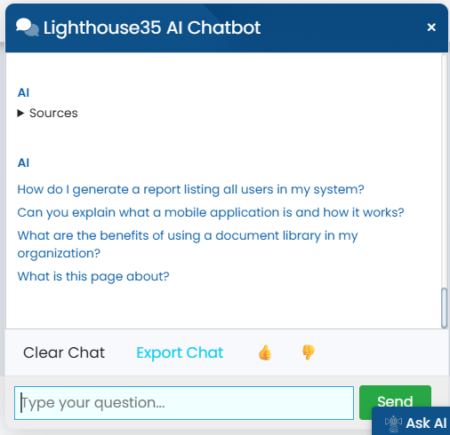 - Displays a responsive chat window with AI-powered answers and suggestions